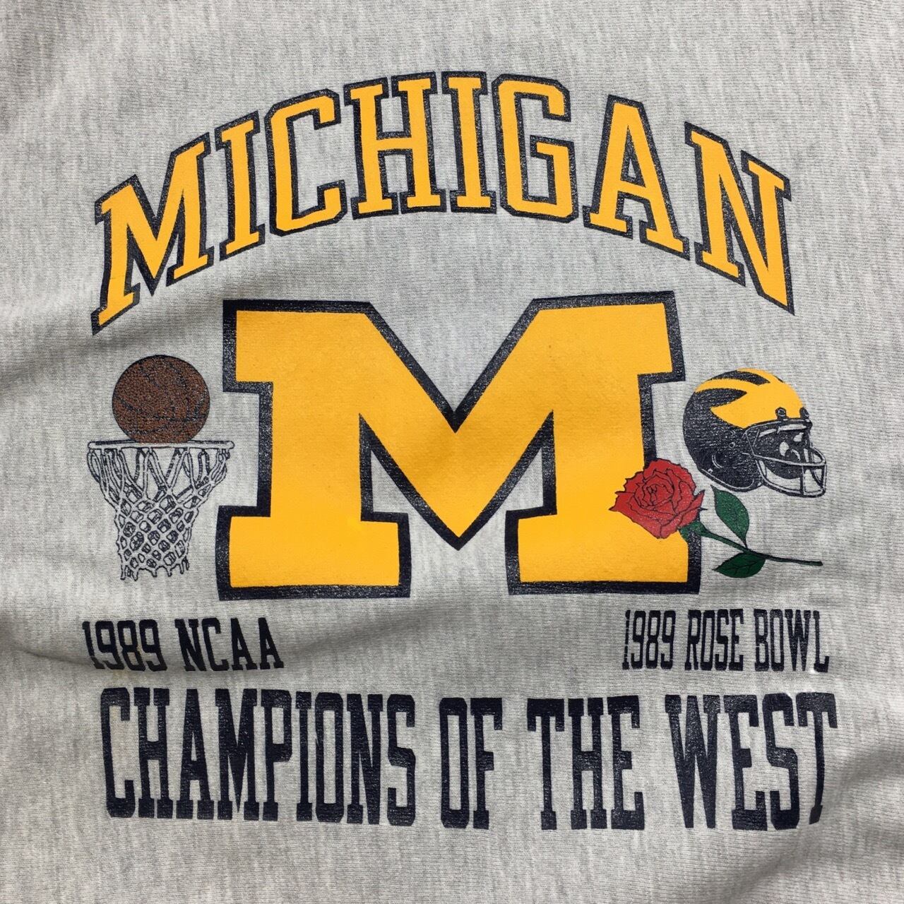 最上部に”MICHIGAN”の文字、中部にはミシガンの”M”とバスケットボール、フットボールのイラストが、優勝年とそれぞれの大会名とともにプリント。最下部には”CHAMPION OF THE WEST”のプリント。