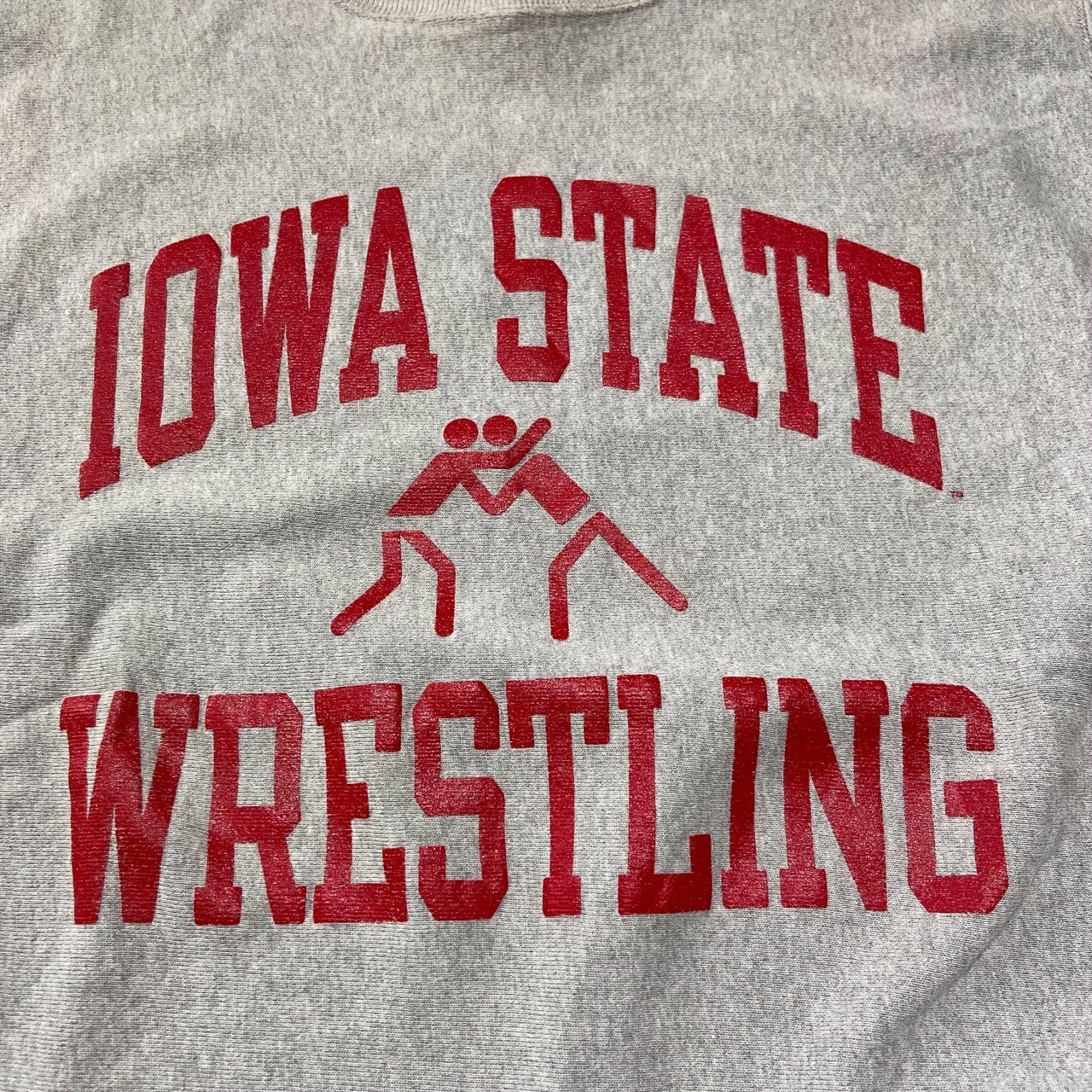 深めのグレーボディの前面に3段で”IOWA STATE WRESTLING”の文字とレスリングのピクトグラムが鮮やかなレッドでプリントされています。