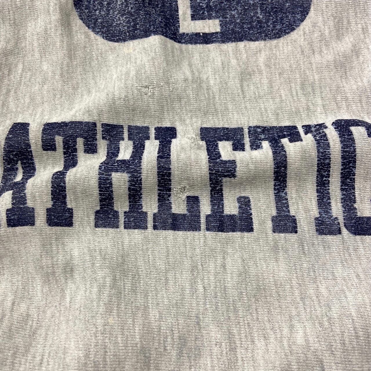 グレーボディの前面に3段で”PENNSTATE ATHLETICS”の文字と人気のカプセルロゴがプリントされている豪華仕様。プリント色はネイビーで、プリントには味のあるひび割れが出てきています。